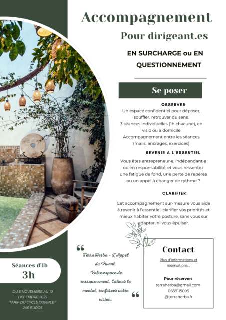 Ces dernières semaines ont marqué un tournant important pour moi et pour TerraHerba – L’Appel du Vivant. Après plusieurs années en salariat-entrepreneuriat au sein de la coopérative d’activité Ouvre-Boîte, j’ai choisi de changer de rythme. À partir du 1er décembre, je poursuis mon chemin sous le statut d’auto-entrepreneure, afin d’exercer plus librement, en cohérence avec mon besoin de prendre soin de moi et de donner à mon activité l’élan et la souplesse dont elle a besoin.